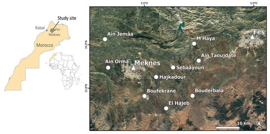 Location of the nine sites (white circles) surveyed during the 2017/2018 and 2018/2019 cropping seasons in Morocco.