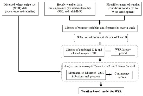 We followed the approach used by El Jarroudi et al. [] to develop a weather-based model for simulating the occurrence of WSR at the selected Moroccan sites during the 2017/2018 and 2018/2019 cropping seasons. A schematic flowchart of the approach is presented in Figure 2.