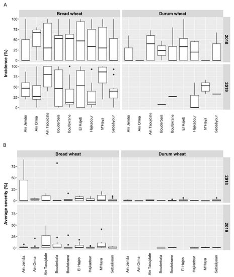 Observed incidences (A) and severities (B) of wheat stripe rust in bread and durum wheat fields at the surveyed sites in Morocco during the 2017/2018 and 2018/2019 cropping seasons.