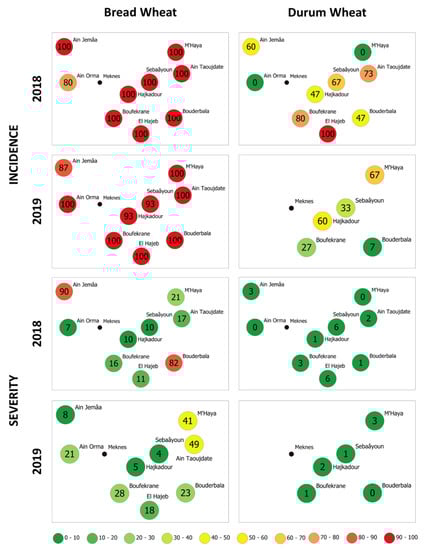 Maps of maximum percentages of wheat stripe rust incidence and severity (%) in bread and durum wheat at the surveyed sites in Morocco during the 2017/2018 and 2018/2019 cropping seasons. The position of the circle corresponds to the site coordinates as presented in Figure 1.