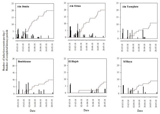 Model calibration phase: simulated infection events per day (bars) and number of completed latency periods (lines) during March–May 2018. The calibration was performed using data of 2017/2018 cropping season for six sites (Ain Jemâa, Ain Orma, Ain Taoujdate, Boufekrane, El Hajeb, and M’Haya).