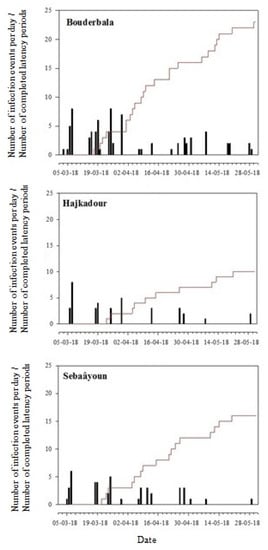 Model evaluation #1: simulated infection events per day (bars) and number of completed latency periods (lines) during March–May 2018. The model evaluation #1 was performed using data of 2017/2018 cropping season for three sites (Bouderbala, Hajkadour and Sebaâyoun).
