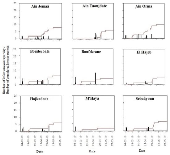 Simulated infection events per day (bars) and number of completed latency periods (lines) during March–May 2019. Observed data for the sites Bouderbala, Boufekrane, Hajkadour, M’Haya, and Sebaâyoun were used in the model evaluation #2 phase.