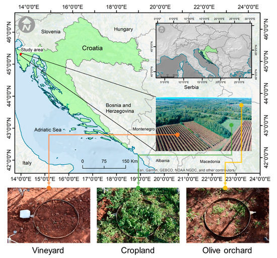 Cropland, vineyard, and olive orchard were used as treatments. Prior to the experiment initiation, land-use practices were investigated. The olive orchard is conventionally tilled each spring by disking to a depth of 10 cm. During the late spring, weeds are suppressed using herbicides (glyphosate-based herbicide “Cidokor” in doze 8 L ha−1). After the harvest, olive and grape pomace are returned to the soil. Mineral fertilizer is also added in the spring before the tillage. Vineyards are tilled to 18 cm depth, 5–6 times per year, in order to keep the soil bare. Here, herbicides are not used since the weeds are suppressed mechanically. Vineyards are fertilized with mineral fertilizers only. Cropland soil for each culture in the rotation is tilled using a disc plow, followed by two passes of roto-harrow, and seedbed preparation before sowing. Herbicides and insecticides are used annually only for cash crops in the rotation. At this land-use, every several years, soils were fertilized with farmyard manure. In the time of measurements, the alfalfa (planted two years before) covered the soil and moved for fodder. In this part of Europe, alfalfa can be used as a source for fodder for 5–7 years, depending on the climate. Cropland was tilled last time in the autumn of 2016.