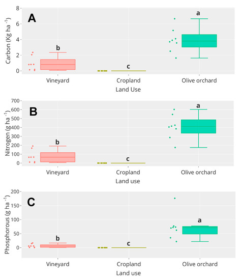 The effects of soil management on the overland flow properties are summarized in Table 2. TP and TR ranged from 202.8 to 1800 s and 740 to 1504 s, respectively. In both cases, the olive orchard showed significantly lower values compared to the other plots. No hydrological response was observed in cropland plots. Run and SC varied from 0 to 53.69 (m3 ha−1) and from 0 to 5.77 (g kg−1), respectively. SL ranged from 0 to 203.9 (kg ha−1). Run and SL were always significantly higher in the olive orchard plots than in the vineyard and cropland. SC was significantly lower in the cropland compared to the other land uses. C loss, N loss, and P loss were in all cases significantly higher in the olive orchard (Figure 2).