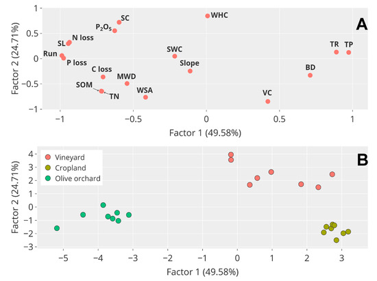 The first three factors explained 83.98% of the total variance (Table S1 in Supplementary Material). Factor 1 explained 49.58%, and Factors 2 and 3 explained 24.71% and 9.96%, respectively, of all variance. Factor 1 had high positive loadings in BD, TP, and TR, and high negative in MWD, SOM, P2O5, TN, Run, SL, C, N, and P loss. Factor 2 had high positive loadings in WHC, and SC and high negative loadings in VC and WSA. Finally, factor 3 had high positive loadings in slope and SWC. The intersection between Factor 1 and Factor 2 shows that BD, TP, and TR are inversely related to the majority of the other variables, especially to Run, N loss, P loss, and SL (Figure 3A). The management practices have different impacts on soil properties and hydrological response in all the treatments. The impact is notably different between the olive orchard and the other treatments. The variability is high in the vineyard and low in cropland (Figure 3A).