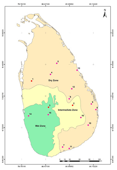 For the sensitivity analysis, we selected three locations (1–3) representing the three climatic zones of Sri Lanka (a wet zone, with a mean annual rainfall of > 2500 mm, a dry zone with a mean annual rainfall of < 1750 mm, and an intermediate zone, with a mean annual rainfall of 1750–2500 mm), while 16 locations (including the above-mentioned three locations) were selected for the functional analysis (Figure 1). For both parts of the analysis, the required APSIM files were prepared as follows.
