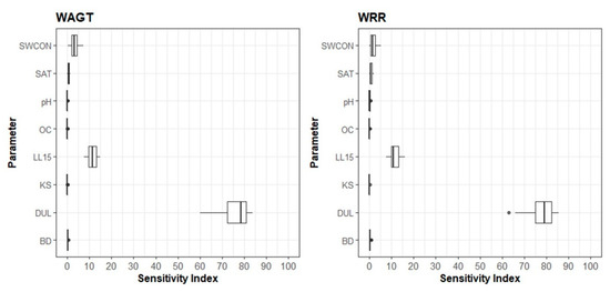 Figure 2 shows a boxplot diagram for the sensitivity index of the eight parameters selected for the model outputs (total above-ground dry matter (WAGT) (kg/ha) and the dry weight of rough rice (WRR) (kg/ha)). The results revealed that DUL is the most influential parameter for the simulation of WAGT and WRR for rice crops, while LL15 showed the second-highest sensitivity to the selected outputs. SWCON and SAT also showed slight sensitivity to the selected outputs. All other selected parameters recorded low sensitivity indices; hence, BD, OC, KS, and pH were identified as less-sensitive soil parameters for WAGT and WRR.