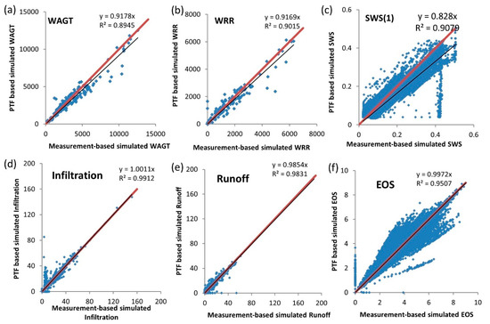 Relationship between use of measurement-based inputs and pedotrandfer functions derived (PTF-based) inputs on simulations of rice, (a) Total above-ground dry matter (WAGT) (kg/ha) of rice; (b) Dry weight of rough rice (WRR) (kg/ha); (c) Soil water content of the topsoil layer (SWS(1)) (mm/mm); (d) Daily infiltration (infiltration) (mm); (e) Daily runoff (runoff) (mm); and f) Potential evapotranspiration after modifications of green cover and residue (EOS) (mm).