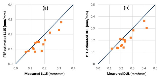 Relationship between the measured and PTF-estimated soil hydraulic parameters (whole soil profile) of the selected soil profiles; (a) lower limit (LL15) and (b) drainage upper limit (DUL).