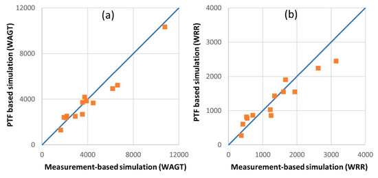 We assessed the accuracy of PTFs using CCC. The CCC values for LL15 and DUL were 0.81 and 0.79, respectively, which were classified as poor [73]. Figure 5 shows the average (2000–2010) maha season WAGT and WRR of the 16 selected locations. The estimated WAGT and WRR showed substantially higher CCC values (0.95 and 0.97 for WAGT and WRR, respectively, which is classified as substantial [73]), thereby confirming a relationship close to 1:1 between the measurement-based simulations and the PTF-based simulations. Nasta et al. [11] conducted a functional assessment of PTFs to predict the soil water budget. They reported the poor performances of the water budget assessment (NSE = 75%) compared to the PTF-estimated variables (NSE = 85%). Therefore, we can conclude that the functionality of PTF is remarkable for APSIM simulations. Nemes et al. estimated the irrigation water requirement [20] and water transport modeling [79] using measured and PTF-estimated soil hydraulic parameters and reported the similarity of both input conditions. Gunarathna et al. [5] also reported the similar irrigation water estimations using PTF-based and measurement-based soil hydraulic data estimations. However, no details on the accuracy assessment have been reported.