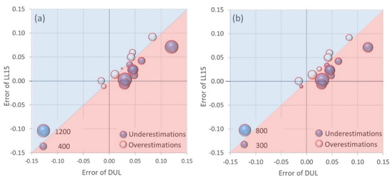 The error variation of PTF-based simulations of average yield (2000–2010) in different locations; (a) total above-ground dry matter (kg/ha); WAGT and (b) weight of rough rice kg/ha; WRR; LL15: Lower limit (mm/mm), DUL: drainage upper limit (mm/mm); The size of the bubble represents the magnitude of the error of the estimated yield.