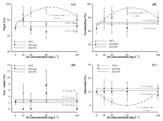 Seed vigor (A), seed germination (B), non-viable seed (C), and abnormal seed (D) of corn after application of different concentrations and sources of Zn. * = significant at 5% of probability by regression test. NS = non-significant at 5% of probability by regression test.