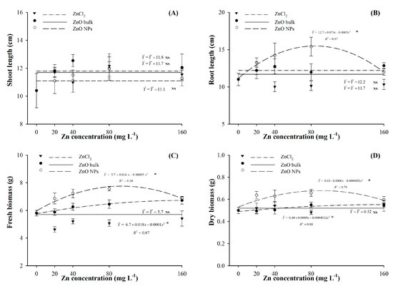 In terms total fresh and dry biomass production, both the soluble source ZnCl2 and ZnO NP promoted statistically significant increases with increasing concentration, so the results show the importance of Zn for growth and development since the total dry biomass production was lower in the treatment devoid of zinc. Despite these effects, on average, application with ZnO NP showed higher dry biomass productions gains, as reported by other authors [7,13,26].