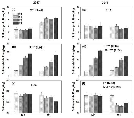 Effect of film mulch (M) and P fertilization (P) on (a,b) inorganic N, (c,d) available P, and (e,f) available K concentrations in soils in 2017 and 2018. M0P0, M0P1, M0P2, M0P3, M1P0, M1P1, M1P2, and M1P3 represent no mulch (M0) and mulch (M1) with four levels of P (P0, P1, P2, and P3), respectively. ***, p ≤ 0.001; **, p ≤ 0.01; *, p ≤ 0.05. Numbers in parentheses are the least significance differences (LSD) among treatments (p = 0.05). Error bars show one standard error of the mean.