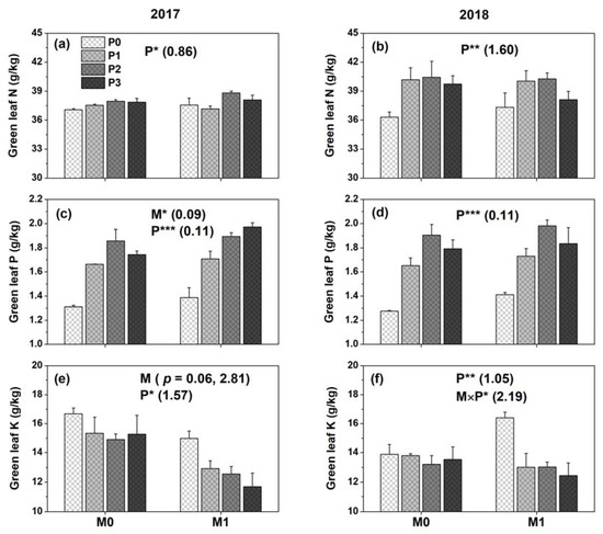 Effect of film mulch (M) and P fertilization (P) on concentrations in green leaves of (a,b) N, (c,d) P, and (e,f) K in 2017 and 2018. M0P0, M0P1, M0P2, M0P3, M1P0, M1P1, M1P2, and M1P3 represent no mulch (M0) and mulch (M1) with four levels of P (P0, P1, P2, and P3), respectively. ***, p ≤ 0.001; **, p ≤ 0.01; *, p ≤ 0.05. Numbers in parentheses are LSD values among treatments (p = 0.05). Error bars show one standard error of the mean.