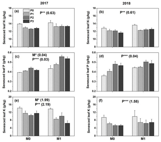 Effect of film mulch (M) and P fertilization (P) on concentrations in senescent leaves of (a,b) N, (c,d) P, and (e,f) K in 2017 and 2018. M0P0, M0P1, M0P2, M0P3, M1P0, M1P1, M1P2, and M1P3 represent no mulch (M0) and mulch (M1) with four levels of P (P0, P1, P2, and P3), respectively. ***, p ≤ 0.001; **, p ≤ 0.01; *, p ≤ 0.05. Numbers in parentheses are LSD values among treatments (p = 0.05). Error bars show one standard error of the mean.