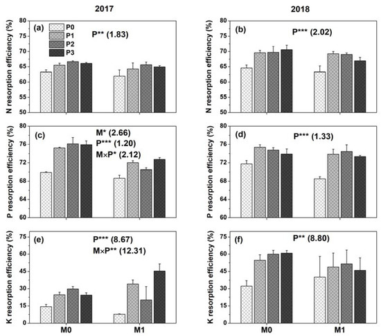 Effect of film mulch (M) and P fertilization (P) on resorption efficiencies for (a,b) N, (c,d) P, and (e,f) K in 2017 and 2018. M0P0, M0P1, M0P2, M0P3, M1P0, M1P1, M1P2, and M1P3 represent no mulch (M0) and mulch (M1) with four levels of P (P0, P1, P2, and P3), respectively. ***, p ≤ 0.001; **, p ≤ 0.01; *, p ≤ 0.05. Numbers in parentheses are LSD values among treatments (p = 0.05). Error bars show one standard error of the mean.
