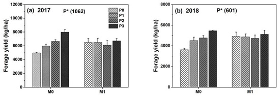 Effect of film mulch (M) and P fertilization (P) on alfalfa forage yield in (a) 2017 and (b) 2018. M0P0, M0P1, M0P2, M0P3, M1P0, M1P1, M1P2, and M1P3 represent no mulch (M0) and mulch (M1) with four levels of P (P0, P1, P2, and P3), respectively. *, p ≤ 0.05. Numbers in parentheses are LSD values among treatments (p = 0.05). Error bars show one standard error of the mean.