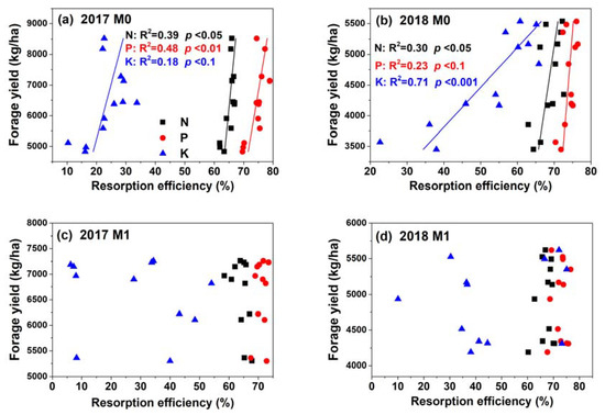 Relationships between N, P, and K resorption efficiencies and alfalfa forage yield in the (a,b) no-mulch treatment (M0) and (c,d) mulched treatment (M1) in (a,c) 2017 and (b,d) 2018.