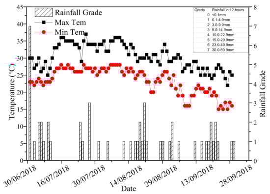 Changes in maximum and minimum temperature and the rainfall grade during the experiment.