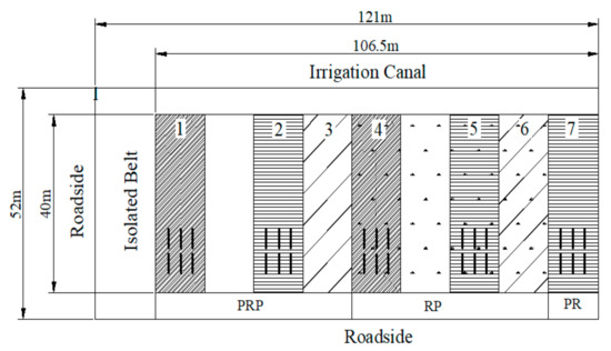 - The experimental field was subdivided into 7 subfields (1–7) as shown in Figure 2; a field without a number was not selected for the experiment. After wheat harvesting, subfields 3 and 6 were cleared from wheat stalk and stubble, while stalks were homogeneously placed on the rest of the fields. Furthermore, three tillage treatments were carried out, i.e., PRP (subfields 1, 2, and 3 were ploughed first; then, we used a rotary tiller and later puddled the fields for more than 40 h), RP (4, 5, and 6 were rotary tilled first and then puddled for more than 40 h), and PR (field 7 was puddled first for more than 40 h and then rotary tilled). Moreover, 1 and 4 were only treated with wheat straw return, and there was no other rice straw return in the previous season before wheat straw return, while the rest (2, 5, and 7) had alternate wheat and rice straw return in every season.