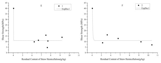 Figure 3 shows the relationship between straw shear strength and the residual content of components under the PRP condition. As depicted in Figure 3A,B, the relationship between straw shear strength and the residual content (RC) of lignin met the exponential decay (ExpDec1) fit (y = y0 + A1 × exp (-(x − x0)/t1)), and the coefficients of determination (R2) for subfields 1 and 2 were 0.93 and 0.94, respectively. After adjustment, the R2 of subfields 1 and 2 was 0.87 and 0.88, respectively. As presented in Figure 3C,D, the relationship between straw shear strength and the residual content (RC) of cellulose met the exponential growth (ExpGro1) fit (y = y0 + A1 × exp ((x − x0)/t1)), and the R2 of subfields 1 and 2 was 0.91 and 0.97, respectively. After adjustment, the R2 of 1 and 2 was 0.82 and 0.93, respectively. Figure 3E,F show the relationship between straw shear strength and the residual content (RC) of hemicellulose met the ExpDec1 fit (y = y0 + A1 × exp (− (x − x0)/t1)), and the R2 of subfields 1 and 2 was 0.91 and 0.93, respectively. After adjustment, the R2 of subfields 1 and 2 was 0.82 and 0.83, respectively.