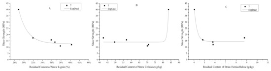 Relationships of straw shear strength and the residual content of components under PR conditions. Note: (A) subfiled7, fitting of Shear Strength and RC of Straw Lignin; (B) subfiled7, fitting of Shear Strength and RC of Straw Cellulose; (C) subfiled17, fitting of Shear Strength and RC of Straw Hemicellulose.