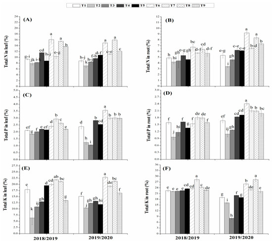 Nutrients (N, P, and K) contents in the leaves (A, C, and E) and in the roots (B, D, and F) of maize plants treated with organic and biofertilizers alone or in combination. (T1 = 100% NPK, T2 = 50% NPK, T3 = Biogas slurry + 50% NPK, T4 = Humic acid + 50% NPK, T5 = Biogas slurry + Humic acid + 50% NPK, T6= Biofertilizer mixture + 50% NPK, T 7= Biogas slurry + Biofertilizers + 50% NPK, T8 = Humic acid + Biofertilizers + 50% NPK, T9 = Biogas + Humic + Biofertilizers + 50% NPK). Different letters mean significant difference at p < 0.05.