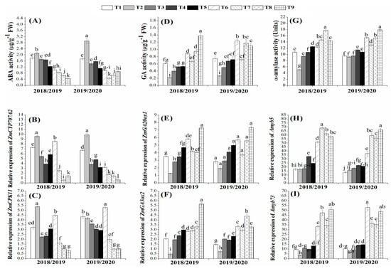 Effects of organic and biofertilizers alone or in combination on ABA activity (A) and its transcription levels (B,C); GA activity (D) and its transcription levels (E,F); α-amylase activity (G) and its transcription levels (H,I) in maize grains. (T1 = 100% NPK, T2 = 50% NPK, T3 = Biogas slurry + 50% NPK, T4 = Humic acid+50% NPK, T5 = Biogas slurry + Humic acid + 50% NPK, T6 = Biofertilizer mixture + 50% NPK, T7 = Biogas slurry + Biofertilizers + 50% NPK, T8 = Humic acid + Biofertilizers + 50% NPK, T9 = Biogas + Humic + Biofertilizers + 50% NPK). Different letters mean significant difference at p < 0.05.