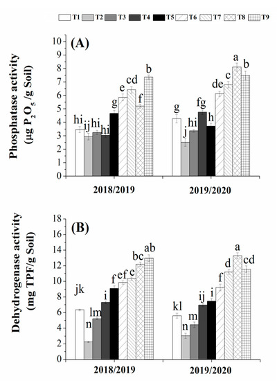 Acid phosphatase (A) and dehydrogenase (B) activities as affected by organic and/or bio-fertilization. (T1 = 100% NPK, T2 = 50% NPK, T3 = Biogas slurry + 50% NPK, T4 = Humic acid + 50% NPK, T5 = Biogas slurry + Humic acid + 50% NPK, T6 = Biofertilizer mixture + 50% NPK, T7 = Biogas slurry + Biofertilizers + 50% NPK, T8 = Humic acid + Biofertilizers + 50% NPK, T9 = Biogas + Humic + Biofertilizers + 50% NPK). Different letters mean significant difference at p < 0.05.