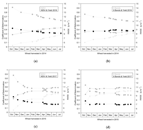 The statistical performances associated with the regular estimates of yield are presented in Figure 4. Whatever the considered case (i.e., estimates based on the NDVI or the combination of satellite reflectances), the evolution of the statistic performance shows comparable behavior, which is an increase of accuracy throughout the growing season. The estimations of yield based on satellite data alone allow an analysis of the gain associated with the addition of new satellite images. For example, estimates based on NDVI show an increase in performance that is generally more pronounced until April. These values saturate at the end of the growing season, and the addition of new acquisitions provides only little improvement. The agricultural season shows a somewhat different evolution, with a gain in performance almost constant throughout the year. Without the input of information from the yield map collected during previous or past rotations, the level of performance is slightly higher considering the combination of the six reflectances.