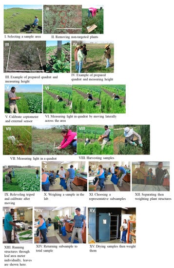 A generalized protocol for sampling plants to determine radiation use efficiency (RUE) from field measurements. The field protocol pictures are adapted from the Grassland Soil and Water Research Laboratory website available at https://www.ars.usda.gov/plains-area/temple-tx/grassland-soil-and-water-research-laboratory/docs/193226#Information.