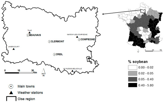 The STICS model [46] was used to estimate the potential yield of soybean. STICS has already been validated for Northern French conditions for wheat and maize [47]. The model has been already parameterized on the soybean GM00 variety in Canada [48], although not yet for GM000. The model requires four main groups of data: climate, soil properties, plant and variety descriptors and crop management. By using the data of four weather stations in the Oise region over the last decade, as described in the climatic suitability paragraph, four climatic areas were identified for soybean around each weather station. The four meteorological stations (Figure 2) were located at Beauvais (49°25′ N, 2°05′ E), Jaméricourt (49°18′ N, 1°52′ E), Le Plessis-Belleville (49°05′ N, 2°45′ E) and Margny-lès-Compiègne (49°25′ N, 2°49′ E). The weather over the last ten years (from 2005 to 2014) was used to run STICS model simulations with daily temperatures (minimal and maximal), global radiation and precipitations, and evapotranspiration measured every ten days.