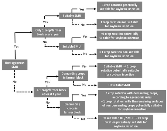 Both soil suitability class (Table 2) and crop rotation(s) in the farmers’ blocks were considered as the agronomic criterion to identify the farmer blocks suitable for the introduction of soybean. Each SMU was characterized by its suitability classes (see previous paragraph), and some SMUs had a single class while others had more than one. By spatially joining the farmer blocks with the SMU, each of them characterized by a suitability class, it was possible to identify if a block was located within a homogeneous SMU (only one suitability class) or not. For farmer blocks located in heterogeneous SMU, the presence of demanding crops (i.e., crops that needs more than 170 mm soil-available water capacity) in the ongoing crop rotation was considered as revealing suitable soils.