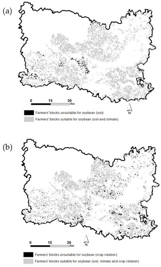 Figure 5a shows the location of the farmers’ blocks where an introduction of soybean is possible, according to the agronomic rules described. Only 4% of the farmers’ blocks area (3304 ha), in both suitable climatic area and soil types, was unsuitable for soybean (Table 7). Long crop rotations including several contract crops and at least one year of rape seed account for this unsuitability on farmers’ blocks located on very good soil types. The grain legume rule contributes to most of the agronomic suitable area, followed by the two cereals rule (Table 7).