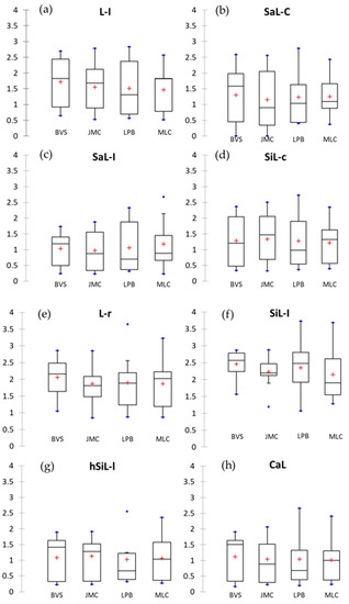 Box plot of the simulated soybean yields (t 0% humidity/ha) with STICS for each soil type (a) L-I, deep loam; (b) SaL-c, Moderately deep sandy loam; (c) SaL-I, Moderately deep sandy loam; (d) SiL-c, Moderately deep silty loam; (e) L-r, Deep loam/silt loam; (f) SiL-I, Deep loam; (g) hSiL-I, Moderately deep silt loam hydromorphic; (h) CaL, Shallow calcareous for ten considered years (2005–2014) in the four stations considered BVS: Beauvais, JMC: Jaméricourt, MLC, Margny-lès-Compiègne, LPB, Le Plessis Bellevile.