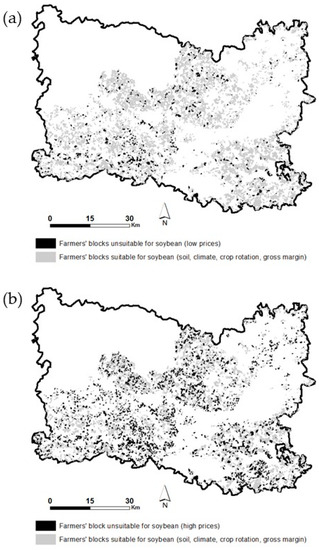 The farmers’ blocks were considered as suitable if they had a difference in gross margin between the re-designed modelled crop rotation with soybean and the ongoing crop rotation of below −50 euros/ha and were thus in the suitable or very suitable cases. Figure 7 highlights the distribution of the suitable and unsuitable farmers’ blocks under a high Figure 7a and a low Figure 7b crop price scenario. In the blocks considered as very suitable (difference of gross margin after soybean introduction higher than +50 euros), the soybean introduction (area and localization) did not appear to change depending on the crop prices. A part of the blocks defined as suitable shifts to unsuitable when the crop price increases (Table 8). This suggests that under high price conditions, soybean is less competitive than other crops. For example, Table 8 shows that 81% of the farmers’ blocks with a two cereal introduction rule are very suitable to soybean introduction under low price conditions, whereas only 10% of the same blocks area is very suitable under high price conditions.