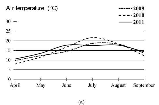 Weather conditions during vegetation seasons, 2009–2011, (a) average air temperature in months, (b) total rainfall in months.