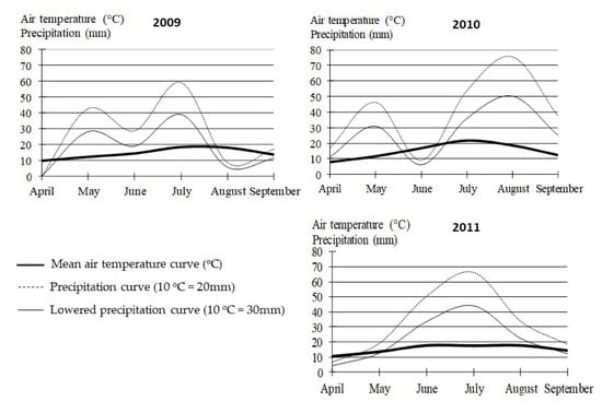 The weather conditions are presented in Figure 1. While the assessment of stress on the individual years is shown in Figure 2. The climate conditions pattern during the vegetation period was defined with the use of the mean air temperature curve (°C), rainfall curve (10 °C = 20 mm) and a lowered rainfall curve (10 °C = 30 mm) according to Gregorczyk et al. []. The values falling within the area defined by the rainfall curve below the temperature curve stand for the period of drought. Area determined by the lowered precipitation curve below the temperature curve—period of semi-drought. In 2009 and 2011 were unfavourable growth in the initial and final growth periods, whereas in 2010, there were unfavourable conditions for potato growth and development during tuberization. Starting from the third week of April to mid-June, semi-drought and drought occurred; the average total rainfall at that time was much lower than the multi-year mean. Furthermore, in 2010, the air temperatures in July and August were much higher as compared with the multi-year mean.
