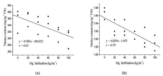As reported by Ciećko et al. [], supplying magnesium in the amount of 7.5 and 15 kg Mg kg−1 in the form of a foliar application received the nitrates content of 200–500 mg kg−1 FW. On the other hand, Hmelak et al. [] and Wadas et al. [] found a much lower nitrate content of 81.1 mg kg−1 FW on average for eleven cultivars, but they used other production systems, locations, potato cultivars and kinds of mineral fertilisation, namely HydroComplex multinutrient complex fertilisers and single-nutrient fertilisers, including Mg.