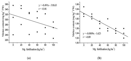 In the present research, the content of nitrites in tubers after harvest ranged from 1.59 to 1.67 mg kg−1 FW, with an average of 1.62 (Table 4). Each of the Mg fertilisation rates applied significantly decreased the content of NO2−1, as did the storage period. The highest losses of nitrites occurred in the initial storage period (after three months). After each of the Mg rates of 20 kg ha−1 were applied, the content of NO3−1 and NO2−1 decreased significantly by 9, 8 and 11, 1 mg kg−1 FW for nitrates and 0, 18 and 0, 17 mg kg−1 FW for nitrites after both three and six months of storage, respectively (Figure 5 and Figure 7). What is noteworthy is the negative correlation between the increasing Mg fertilisation rates and the content of NO3−1 in tubers after harvest (r = −0.63) and after storage, both after three (r = −0.46) and after six (r = −0.56) months (Figure 3, Figure 5 and Figure 7). This is probably due to the fact that Mg supplies significantly increase the content of Mg in tubers [,].