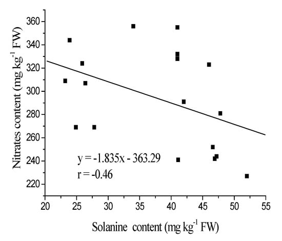 Moreover, under certain storage conditions, nitrate can be converted into nitrite in vegetables. Nitrite tends to increase dramatically via the microbiological reduction of nitrate in vegetables, and nitrate content decreases during a period of storage at ambient temperatures []. However, physical damage during harvest or transportation, exposure to light and bad storage conditions may cause the concentrations of glycoalkaloids to increase in tubers, and they are considered to be part of the plant’s defence mechanism [,].