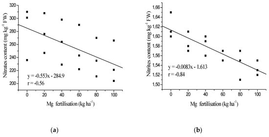 The significant relationship between the dose of magnesium fertilisation and NO3−1 (a), NO2−1 (b) contents in the potato tubers after 6 months of storage. R—p ≤ 0.05.