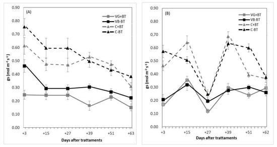 Stomatal conductance (gs) expressed as mol m2 s−1 measured in control (C) and treated with Vapor Gard (VG) Falanghina vines in 2013 (A) and 2014 (B). Bunch thinned vines are reported as BT. Data are averages of 10 replicates ± SE.