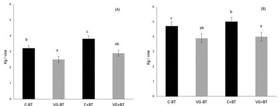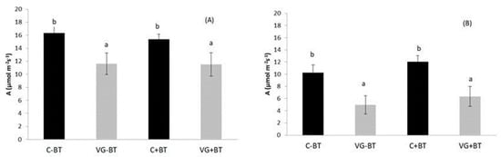 These results show that the film-forming anti-transpirant is able to active a transient inhibition of leaf photosynthetic rate confirming the findings obtained on other grape cultivars, such as Sangiovese [,,], Barbera [], Sauvignon blanc [] and Aglianico []. Similar results were obtained regarding the leaf assimilation rate (A). Indeed, at harvest, it was higher in the control vines compared to the treated ones in both the studied years. In particular, in 2013, 11.6 vs. 16.3 µmol m2 s−1 for VG-BT and C-BT, respectively, were recorded, with a 29% reduction of leaf assimilation rate. Comparable results were observed in bunch thinned plants in the same year: 11.5 vs. 15.4 µmol m2 s−1 (VG + BT vs. C-BT) with a 25.3% of reduction (Figure 2A).