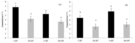 In 2014, VG treatment showed an assimilation rate of 4.96 µmol m2 s−1, while the respective control (C) recorded 10.27 µmol m2 s−1. In the bunch thinning treatment, the results were similar: 6.34 vs. 12.04 µmol m2 s−1 (VG + BT vs. C + BT) (Figure 2B). In both treatments, the percentage of reduction of leaf assimilation rate was about 47.8 in percentage. As expected, in both growing seasons, this parameter was significantly affected by the anti-transpirant treatment, while no effect was recorded by bunch thinning. Our results are in accordance with [] which showed that, after VG application, Sangiovese sprayed leaves had lower A than control leaves. Due to different weather conditions the reduction of leaf assimilation rate was variable among the two considered growing seasons, similarly the transpiration rate (E) showed a similar trend in 2013 and 2014 but with different values. Significant differences were found between treated vines and controls. In 2013, E measured at harvest was 6.81 mmol H2O m2 s−1 in the control and 4.23 mmol H2O m2 s−1 in the VG treated Falanghina vines (Figure 3A).