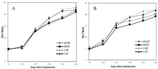 In both years, indeed, VG treated grapes showed the lowest sugar content at harvest, with a difference of 0.9 and 2.7 °Brix compared with the control in 2013 and 2014, respectively (Table 1 and Figure 5). The lower accumulation of sugars in the berries, between the theses treated with VG and not, is evident from the 15th day after the treatment in 2014 and in 2013 (Figure 5A,B). In 2013, bunch trimming determined an increase of TSS (+1.2 °Brix respect to the control), while in 2014 it did not determine significant differences. Similarly, pH and titratable acidity, which are important metabolic and qualitative parameters [,,], did not show significant differences among treatments in both years.