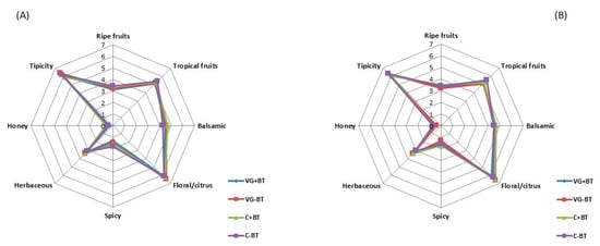Odour profiles of the Falanghina experimental wines obtained in 2013 (A) and 2014 (B).