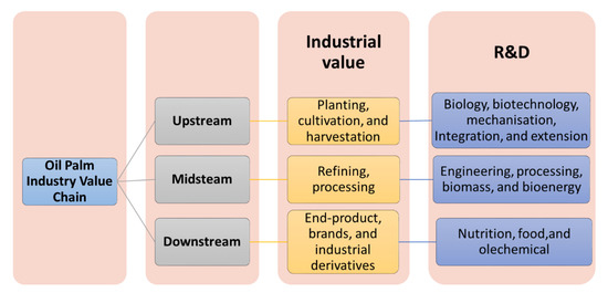 The oil palm industry value chain and research and development (R&D) of oil palm cultivation can be divided into three segments; upstream, midstream, and downstream (Figure 1) [3].